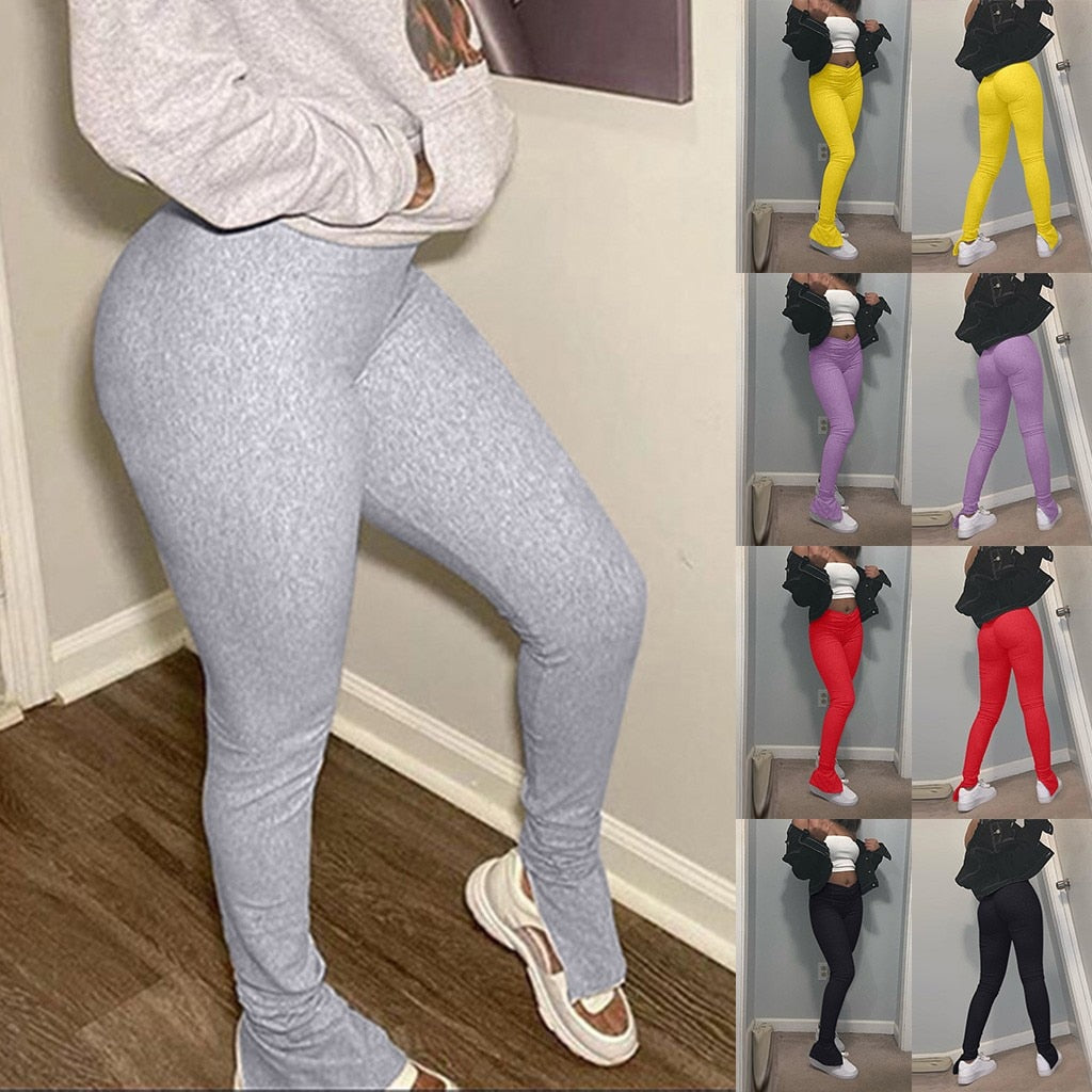 High Waist Sweatpants Women Joggers 2020 Elastic Summer Stacked Leggings Bell Bottom Trouser Split Hem Flare Ruched Pant#W3